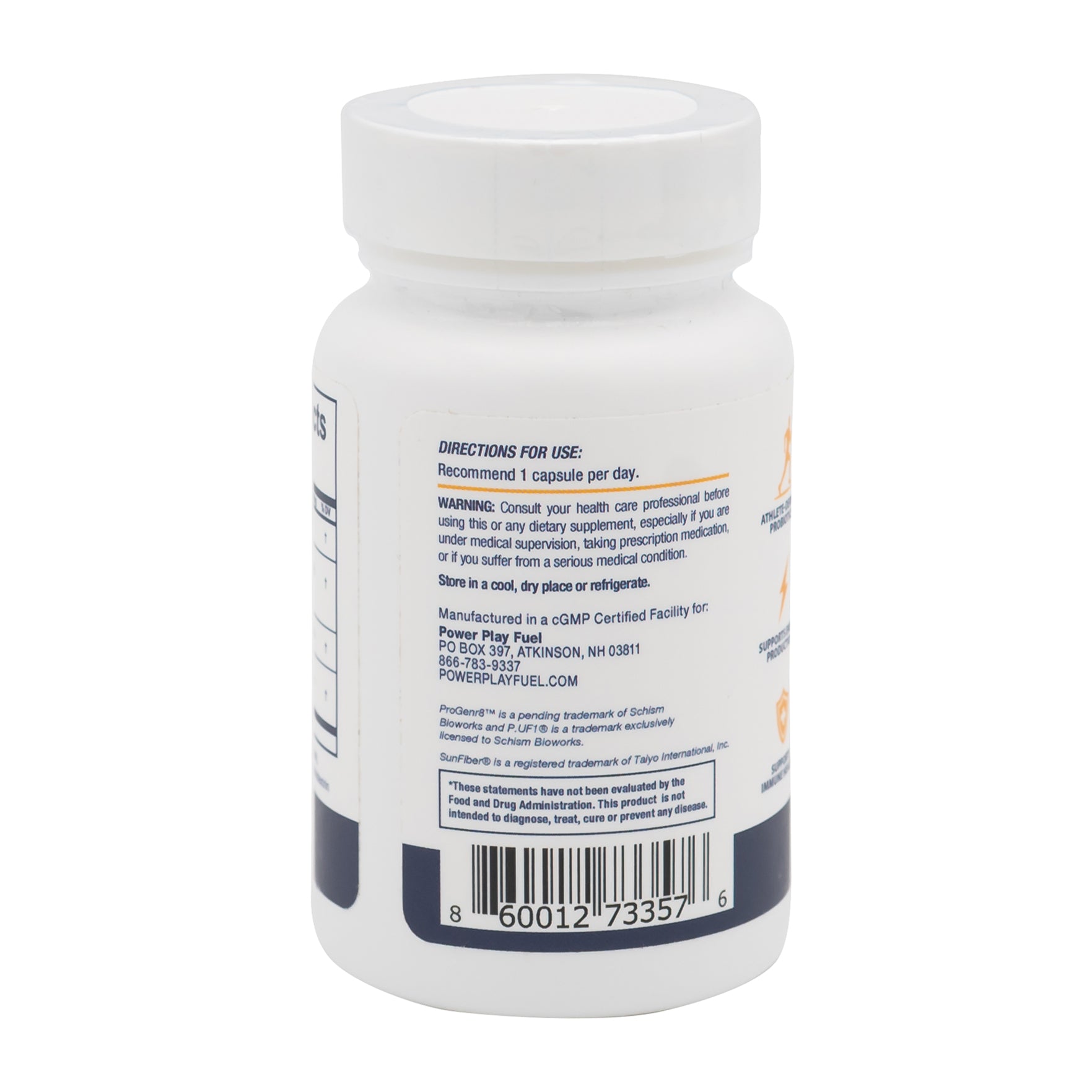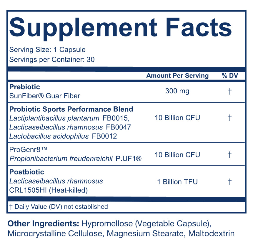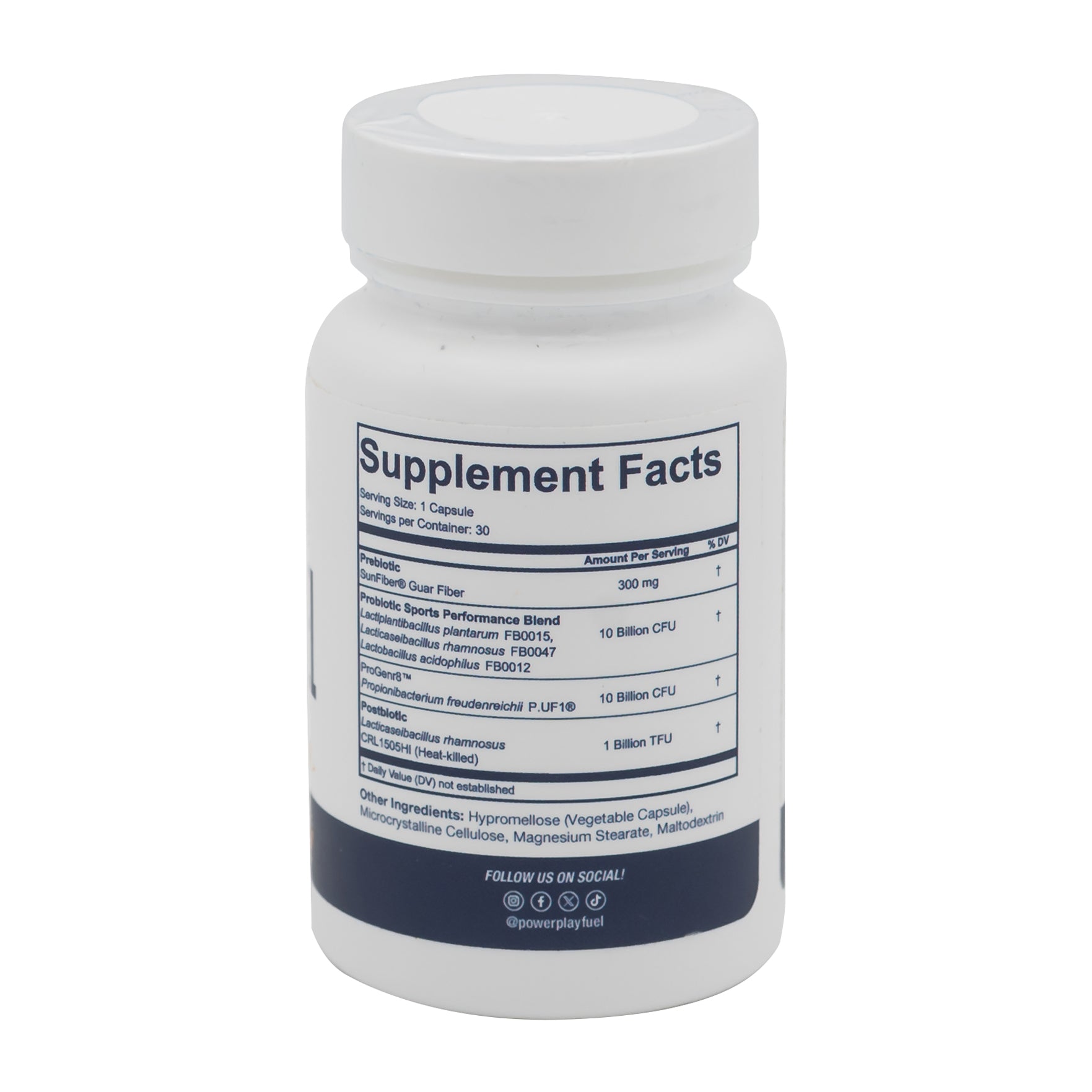 Gut Fuel combines Nella®, a clinically validated performance probiotic (10B CFU of patented Lactobacillus strains), with Sunfiber® soluble dietary fiber to deliver comprehensive pre-, pro-, and postbiotic support. Developed using metagenomic sequencing and athlete-derived strains, Nella® helps optimize microbial diversity along the gut-brain-immune axis, supporting digestive comfort, regularity, and resilience. Sunfiber® ferments steadily and gently to promote satiety, a low glycemic response, and improved absorption of nutrients. Together, these trademark ingredients back quality, purity, and safety while helping support immune health, natural energy for training days, and more restful sleep as part of a consistent wellness routine. In easy-to-take vegetarian capsules, Gut Fuel fits seamlessly into daily hydration and nutrition—ideal for athletes and anyone looking to keep their microbiome on point.